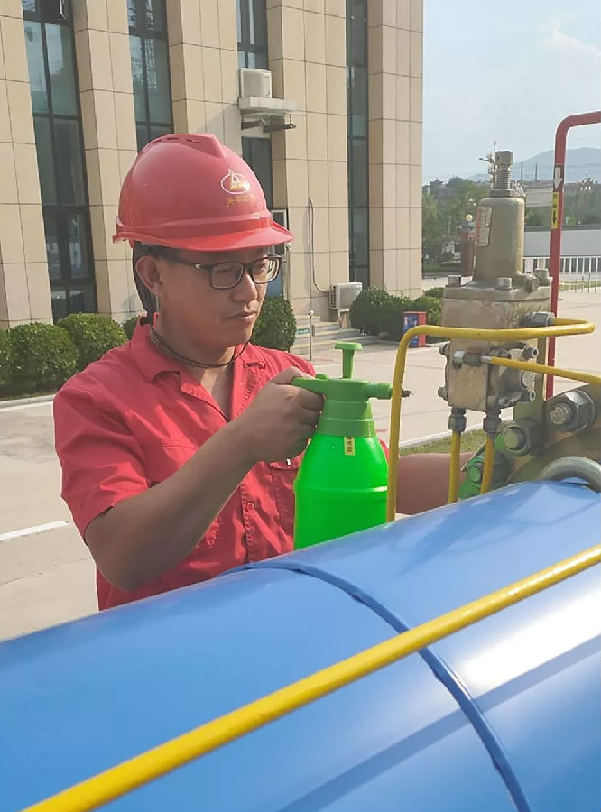 他們的職責是保障站區安全平穩供氣。在站區的工藝區,值班人員正在進(jìn)行日常巡察。烈日之下,他們不放過(guò)每一個(gè)閥門(mén)、接口處,仔細用檢漏液檢測是否漏氣,同時(shí)認真記錄數據。夏季管道與環(huán)境溫差大,加上氣候潮濕,管道上產(chǎn)生的冷凝水滴落下來(lái),很容易在地面和管道上生成青苔,既影響值班人員操作,又不美觀(guān),存在不安全因素。值班人員時(shí)常頂著(zhù)高溫清理青苔,衣服經(jīng)常濕了干干了濕?!鞍踩ぷ鳑](méi)有小事,任何事都得重視?!痹谒麄兛磥?lái),日復一日的守護容不得半點(diǎn)馬虎,時(shí)刻保持警惕之心才能讓站區運行更加穩定。